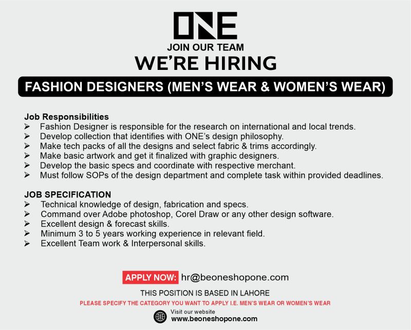 Position: Fashion Designers (Men’s Wear & Women’s Wear) Location: Lahore, Pakistan