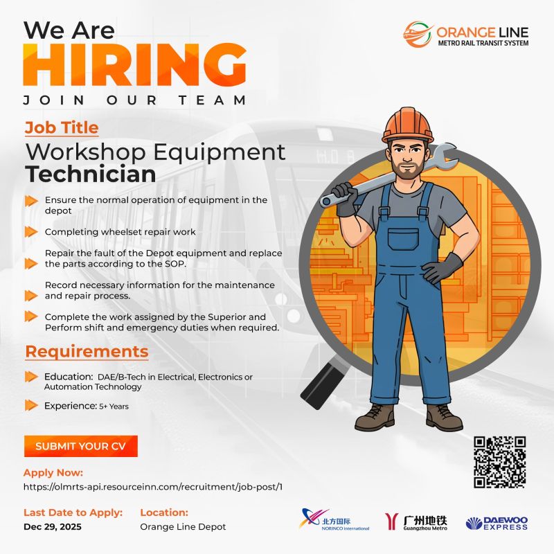 Orange Line Metro Rail Transit System (OLMRTS) is looking for a 𝐖𝐨𝐫𝐤𝐬𝐡𝐨𝐩 𝐄𝐪𝐮𝐢𝐩𝐦𝐞𝐧𝐭 𝐓𝐞𝐜𝐡𝐧𝐢𝐜𝐢𝐚𝐧 to be part of our growing team.