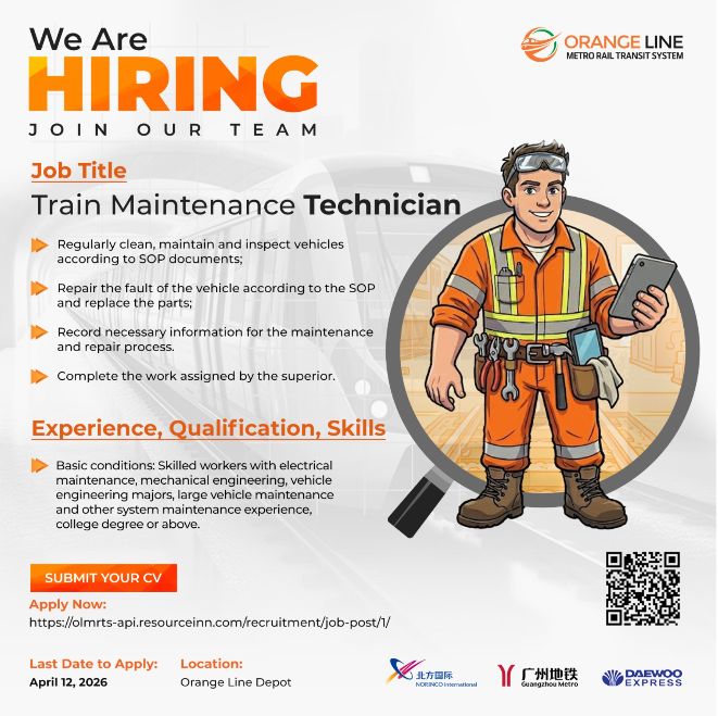 Orange Line Metro Rail Transit System (OLMRTS) is looking for a 𝐓𝐫𝐚𝐢𝐧 𝐌𝐚𝐢𝐧𝐭𝐞𝐧𝐚𝐧𝐜𝐞 𝐓𝐞𝐜𝐡𝐧𝐢𝐜𝐢𝐚𝐧 to be a part of our growing team.