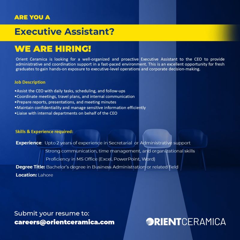Orient Ceramica is looking for a highly organized and proactive Executive Assistant to the CEO to provide high-level administrative and executive support at our Lahore Head Office.