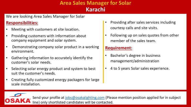 Position: Area Sales Manager for Solar – Karachi