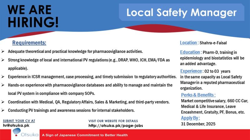 - Experience: 02 to 03 years in the same capacity as Local Safety Manager in a reputed pharmaceutical organization.