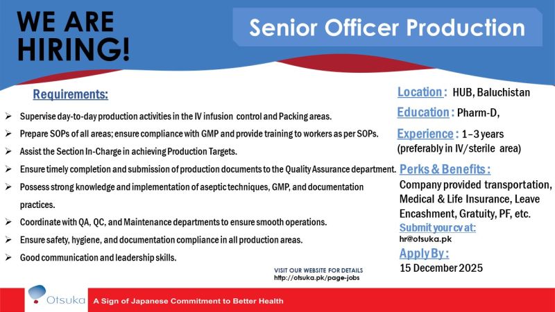 - Experience: 1 – 3 years (preferably in IV/sterile area)
