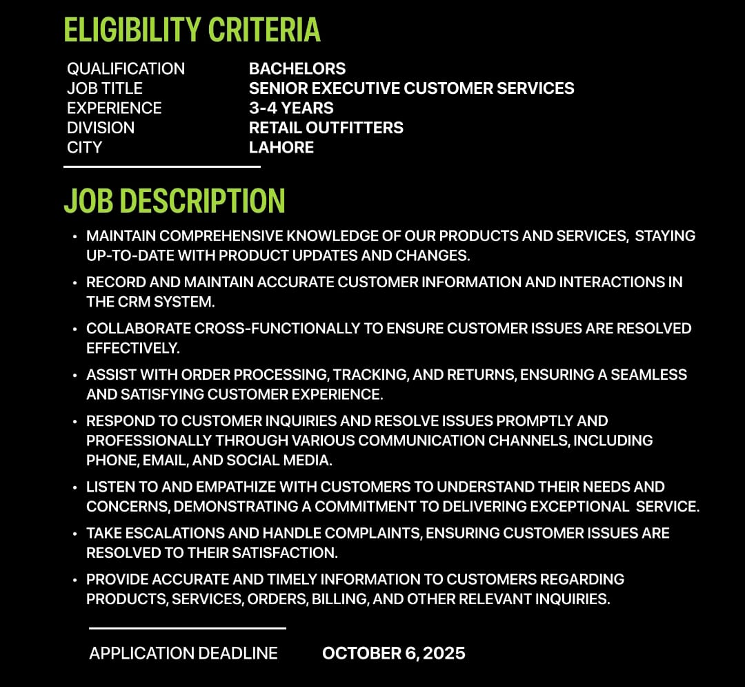 Outfitters Stores Pvt Ltd Jobs Senior Executive Customer Services