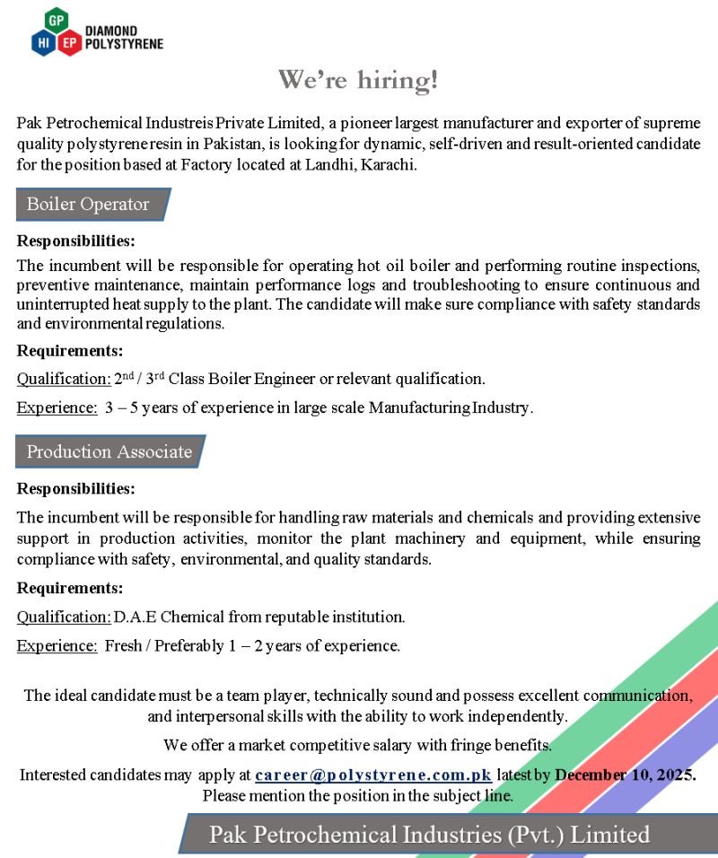 Pak Petrochemical Industries (Pvt.) Ltd. is looking for a Boiler Operator and Production Associate for its Factory located at Landhi & Port Qasim, Karachi.