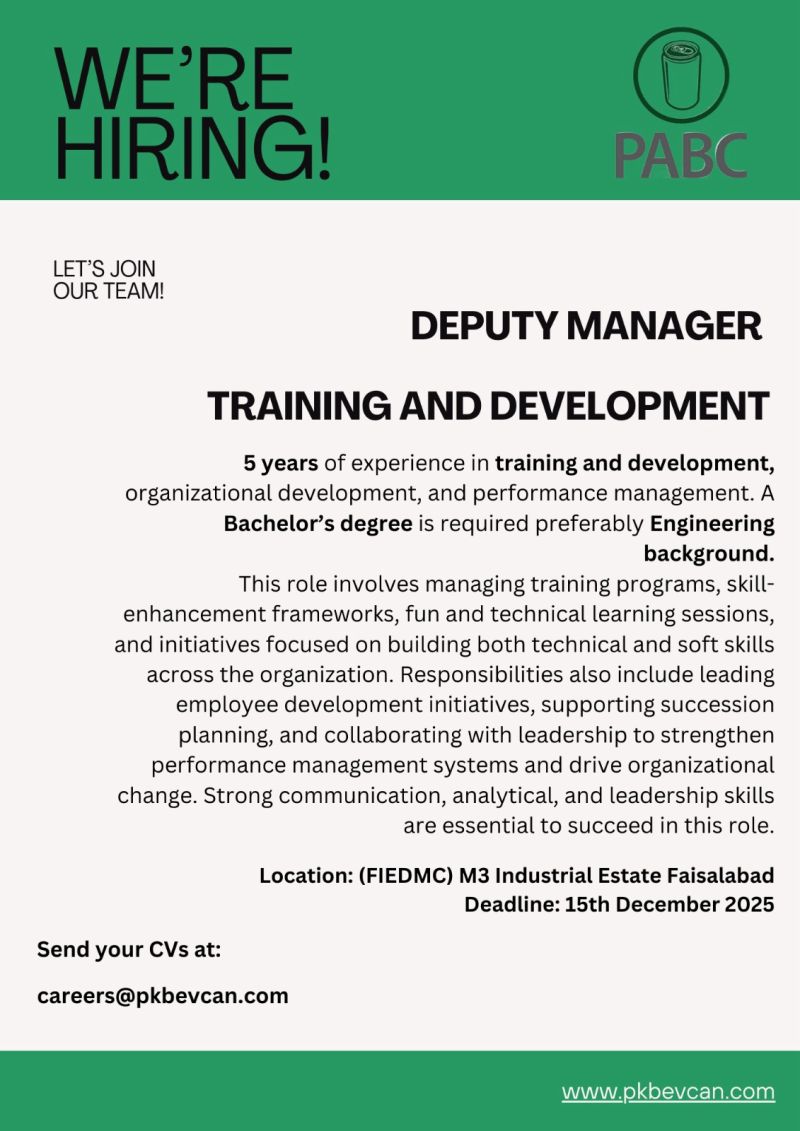 Pakistan Aluminium Beverage Cans Limited PABC Jobs Deputy Manager Training & Development