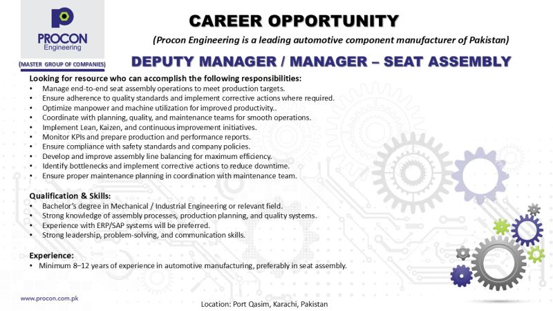 Procon Engineering Jobs Deputy Manager / Manager Seat Assembly :