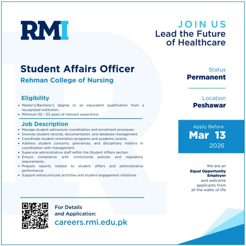 Rehman Medical Institute RMI Jobs Student Affairs Officer