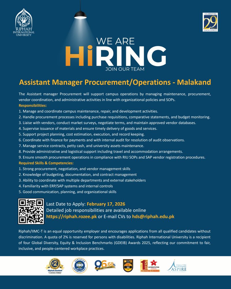 Riphah International University Jobs Assistant Manager Procurement / Operations :
