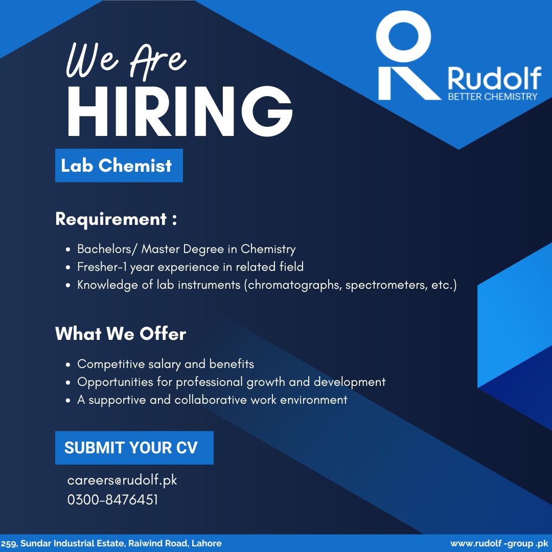 Rudolf Pakistan (Pvt.) Limited is seeking an individual for the role of Lab Chemist in our Customer Service Lab. We welcome applications from freshers to experienced candidates who have a strong background in this role.