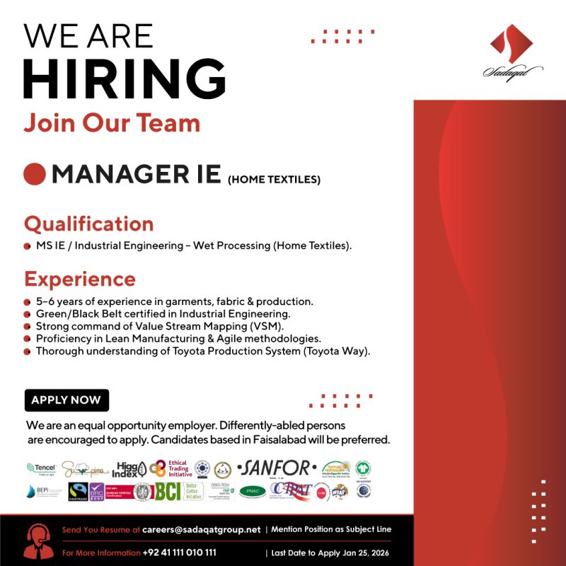 Sadaqat Group is seeking a skilled Manager IE (Home Textiles) with strong expertise in Industrial Engineering, Lean Manufacturing, and process optimization.