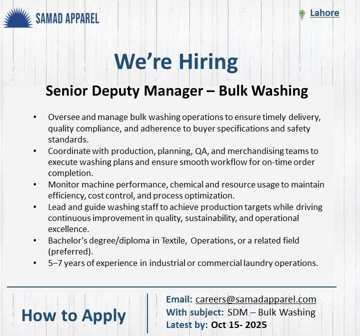 Samad Apparel Pvt Ltd Jobs Senior Deputy Manager: