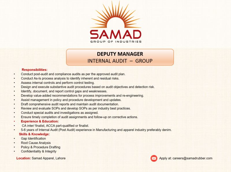 Samad Group of Industries Jobs Deputy Manager Internal Audit: