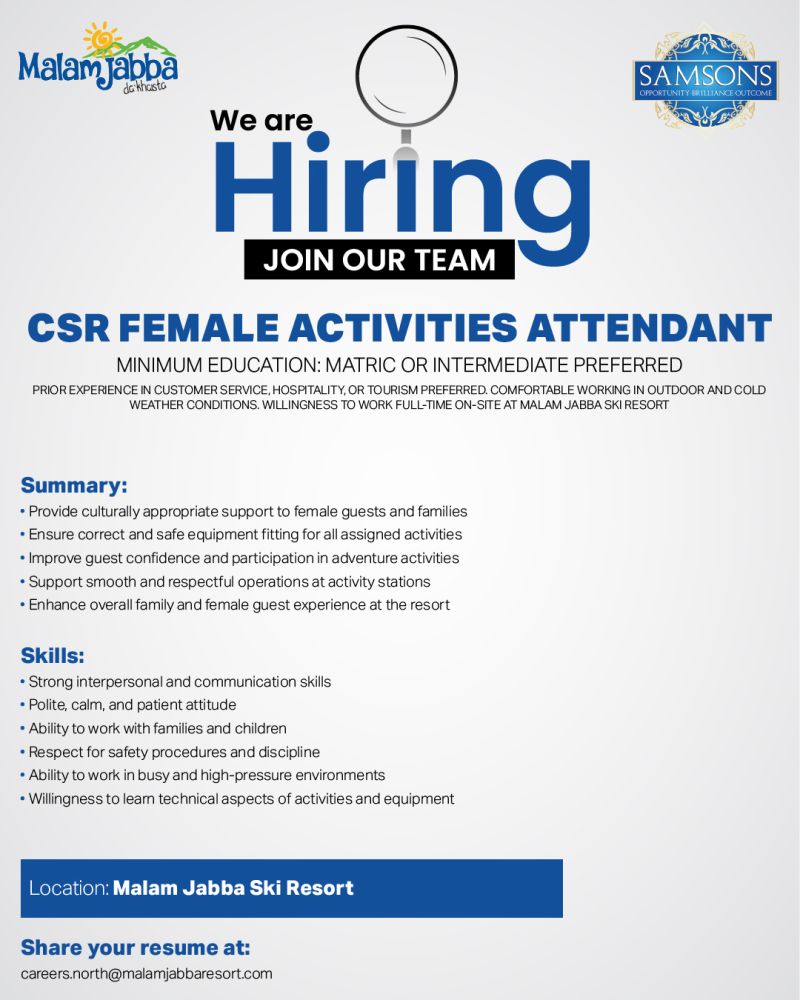 • Availability: Willingness to work full-time on-site at Malam Jabba Ski Resort.
