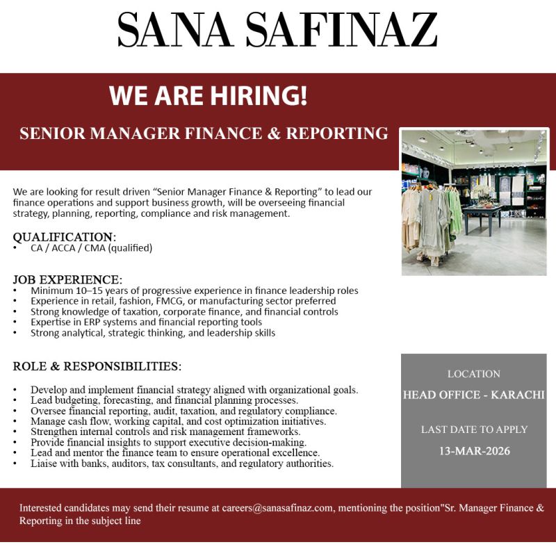 Sana Safinaz Jobs Senior Manager Finance & Reporting: