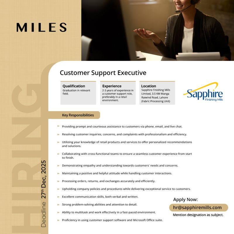 Sapphire Finishing Mills Jobs Customer Support Executive  1