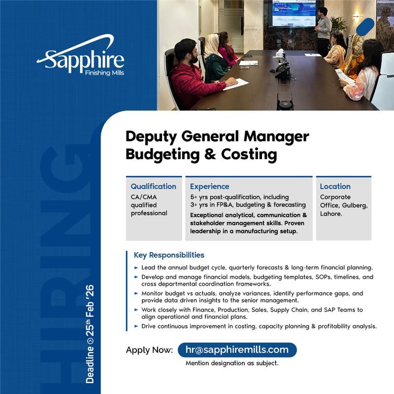 Sapphire Finishing Mills Jobs Deputy General Manager Budgeting & Costing