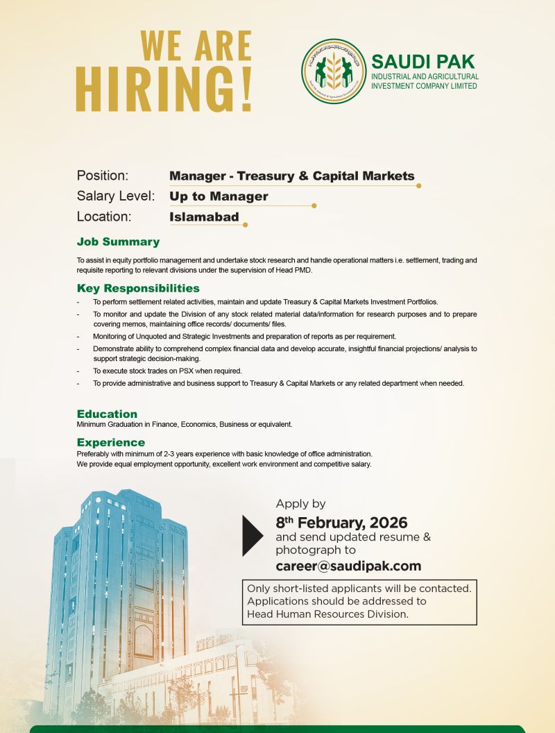 Saudi Pak Industrial and Agricultural Investment Company Limited Jobs Manager Treasury & Capital Markets: