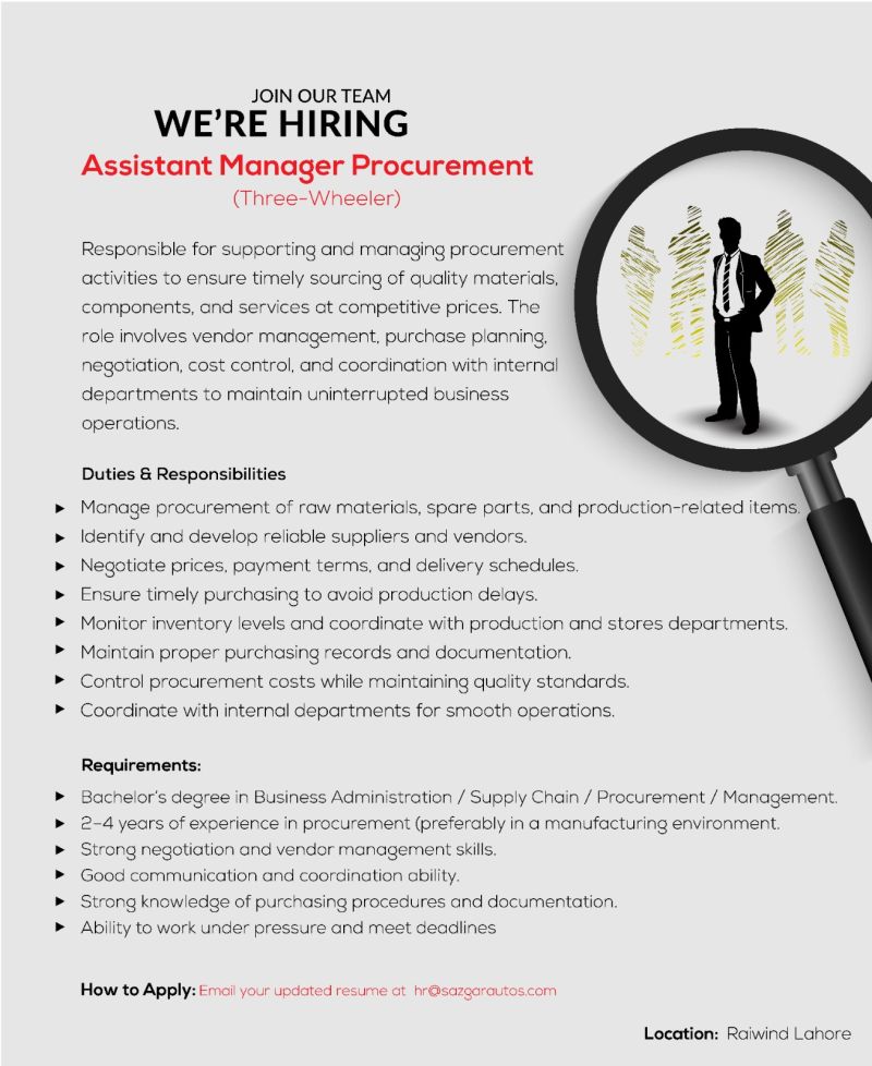 Join our dynamic team as “Assistant Manager Procurement” and play a key role in ensuring efficient sourcing, vendor management, and cost optimization for our Three-Wheeler division.