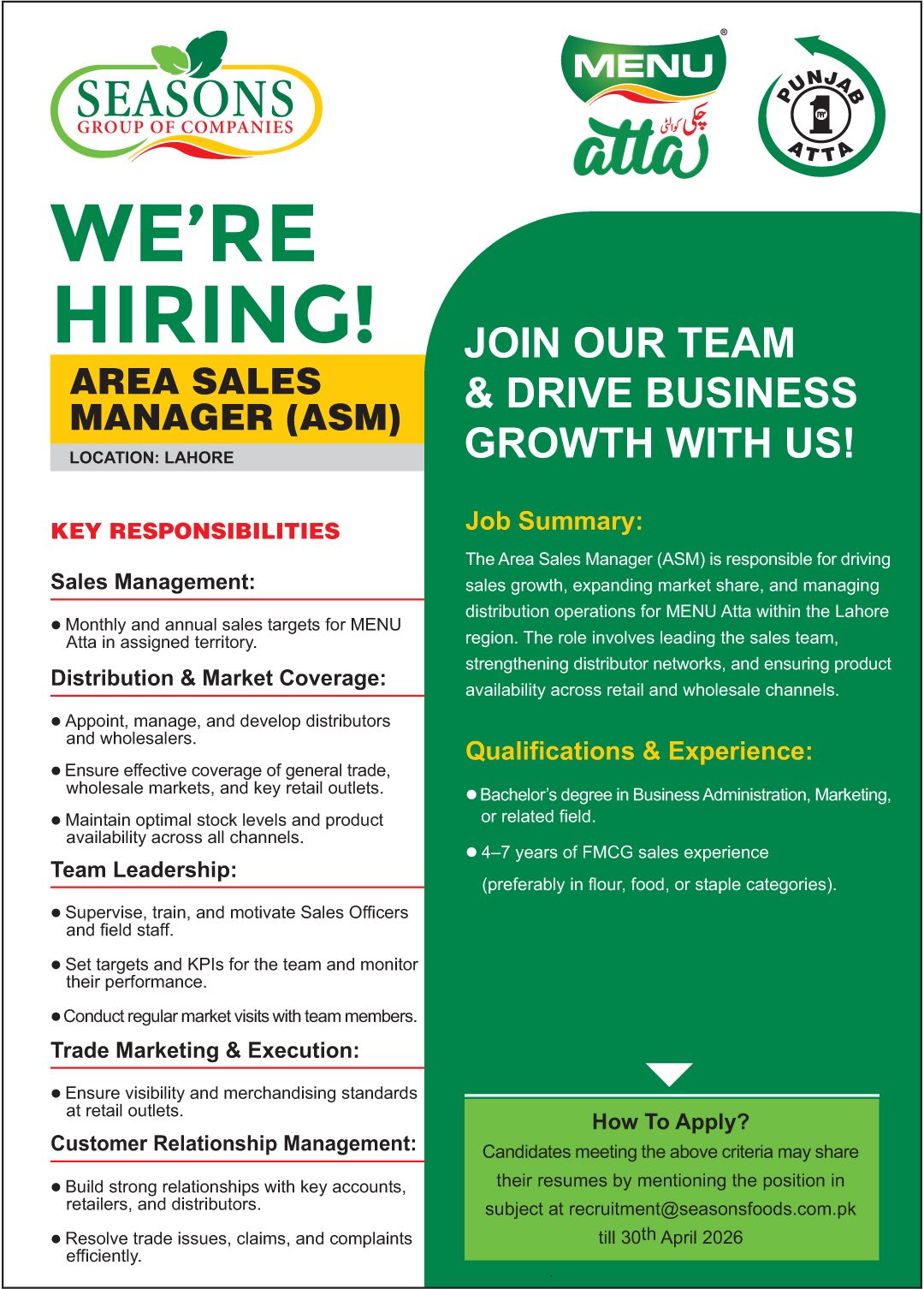 The Area Sales Manager (ASM) is responsible for driving sales growth, expanding market share, and managing distribution operations for MENU Atta within the Lahore region. The role involves leading the sales team, strengthening distributor networks, and ensuring product availability across retail and wholesale channels.