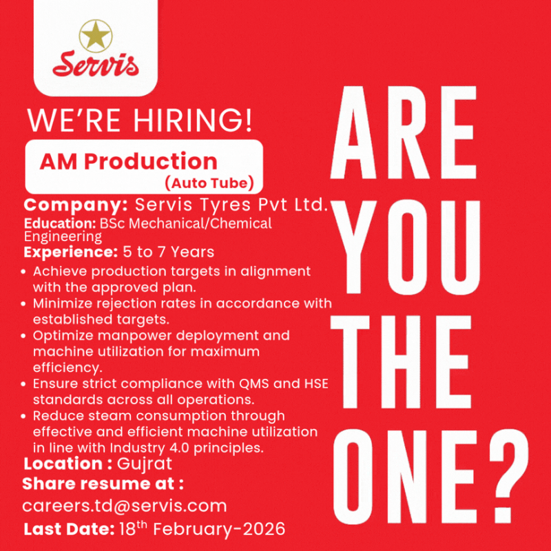 Servis Tyres Pvt Ltd is looking to hire an Assistant Manager Production (Auto Tube).