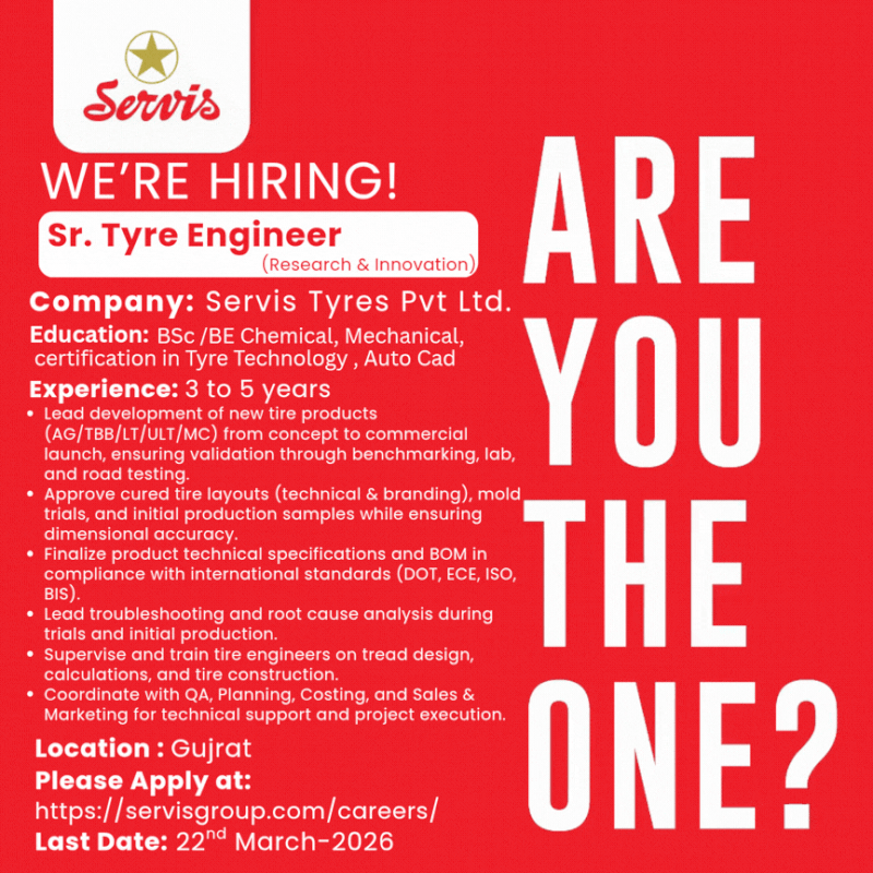 Servis Tyres Pvt Ltd is looking to hire a Sr. Tyre Engineer.