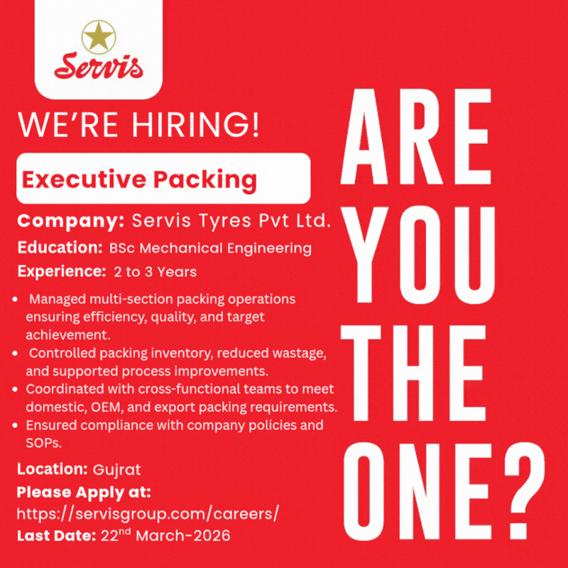 Servis Tyres Pvt Ltd is looking to hire an Executive Packing.
