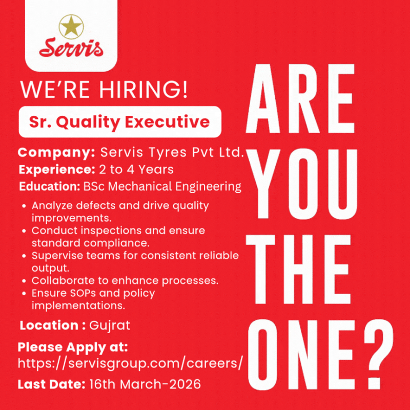 Servis Tyres Pvt Ltd is looking to hire a Sr. Quality Executive.