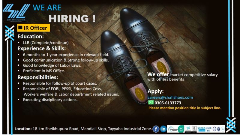 Shafi Pvt Ltd Jobs IR Officer: