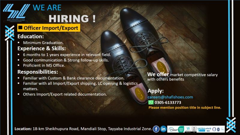 Shafi Pvt Ltd Jobs Officer Import/Export