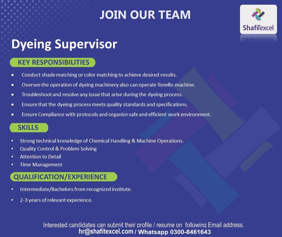 Shafi Texcel Pvt Ltd Jobs Dyeing Supervisor: