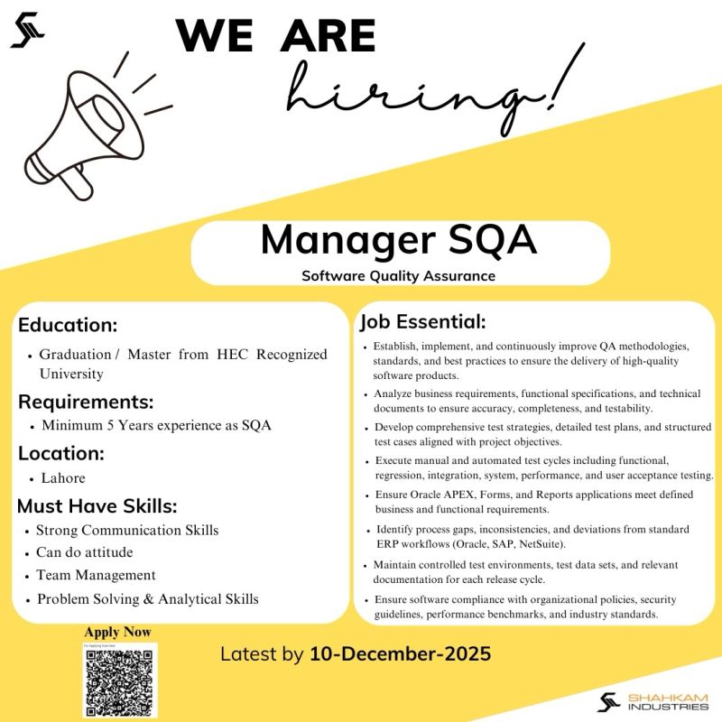 Shahkam Industries Limited Jobs Manager SQA
