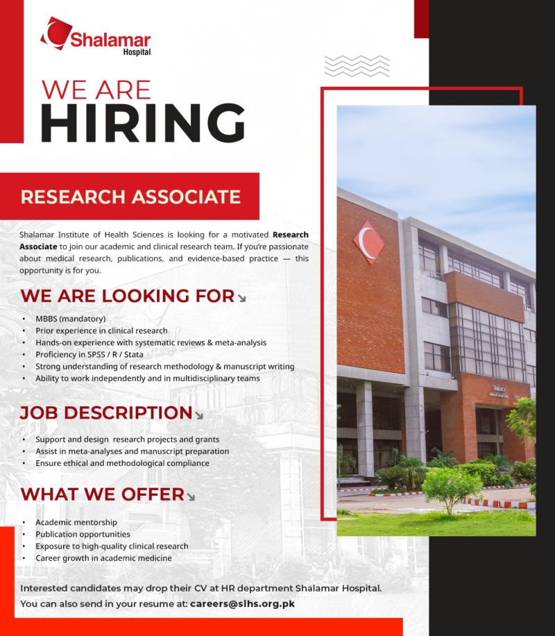 Shalamar Institute of Health Sciences is inviting applications for the position of Research Associate to join our academic and clinical research team.