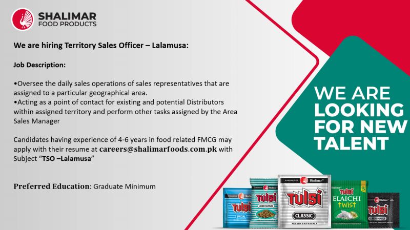 Candidates having experience of 4-6 years in food related FMCG may apply with their resume at 𝐜𝐚𝐫𝐞𝐞𝐫𝐬@𝐬𝐡𝐚𝐥𝐢𝐦𝐚𝐫𝐟𝐨𝐨𝐝𝐬.𝐜𝐨𝐦.𝐩𝐤 with Subject “TSO –Lalamusa”