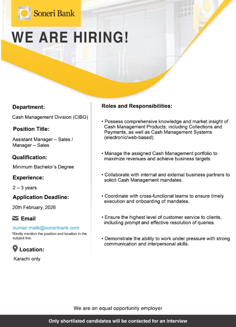 Soneri Bank is looking for Assistant Manager – Sales / Manager – Sales, Cash Management Division Department.