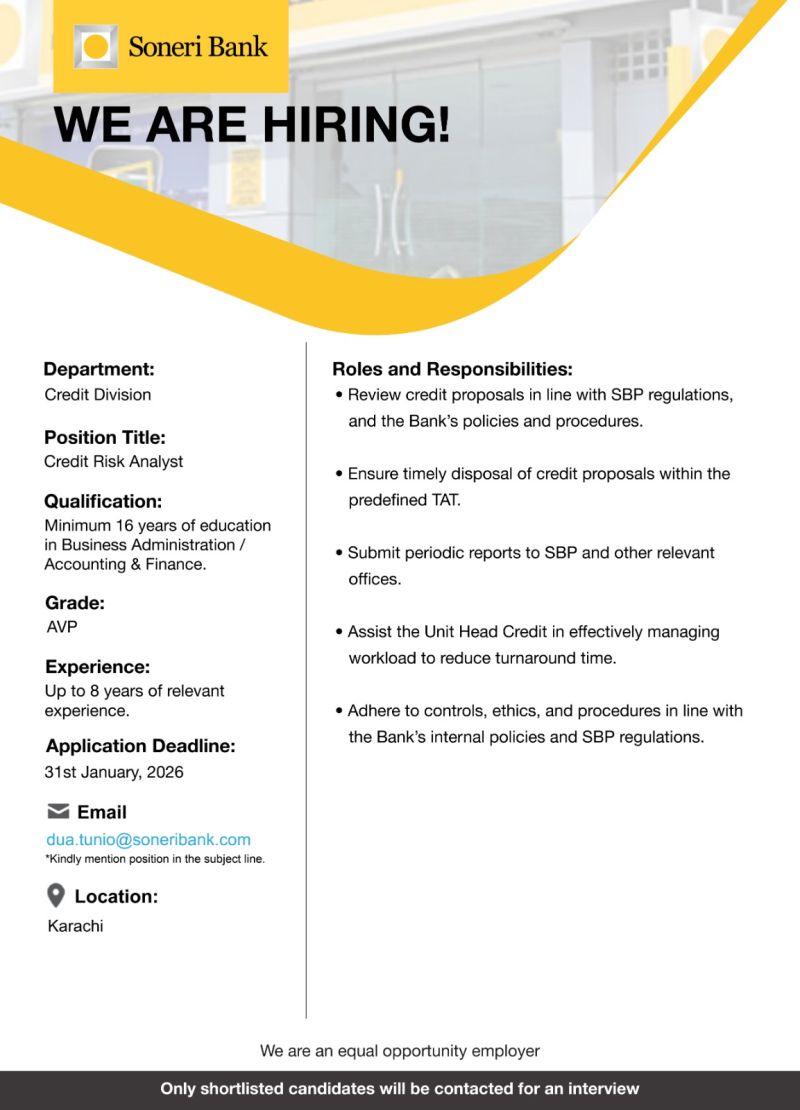 Soneri Bank is looking for Credit Risk Analyst, Credit Division Department.