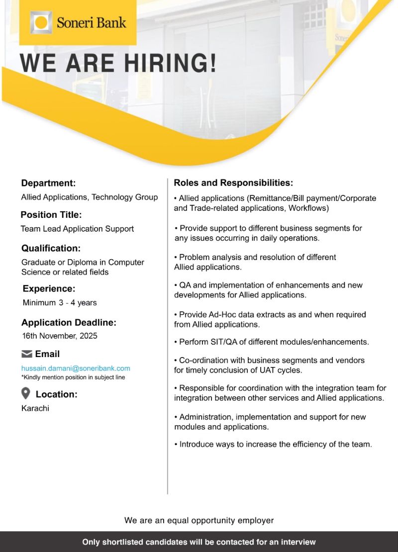 Soneri Bank is looking for a Team Lead Application Support, Allied Applications, Technology Group Department.