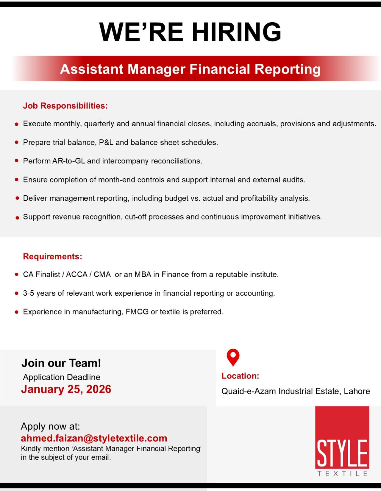 Join our Team! Application Deadline: January 25, 2026 Location: Quaid-e-Azam Industrial Estate, Lahore