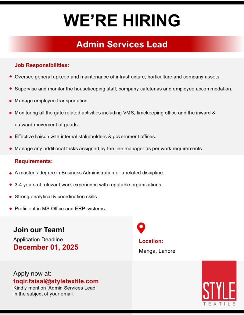 Apply now at: [email protected] Kindly mention ‘Admin Services Lead’ in the subject of your email.