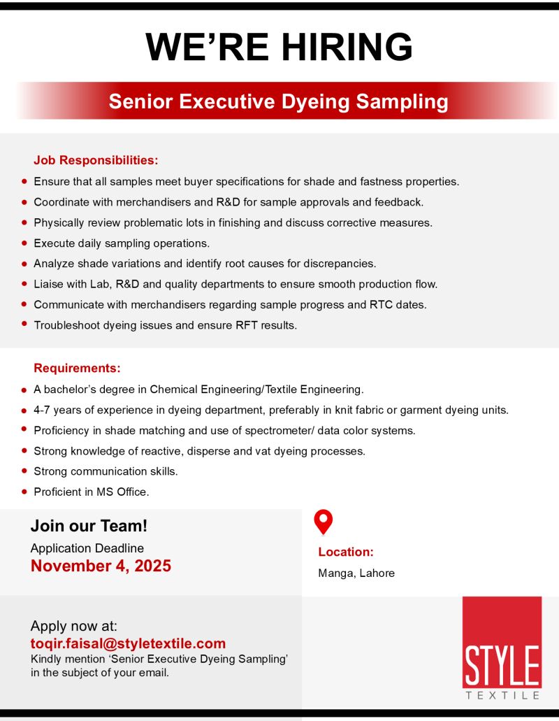 WE’RE HIRING Senior Executive Dyeing Sampling