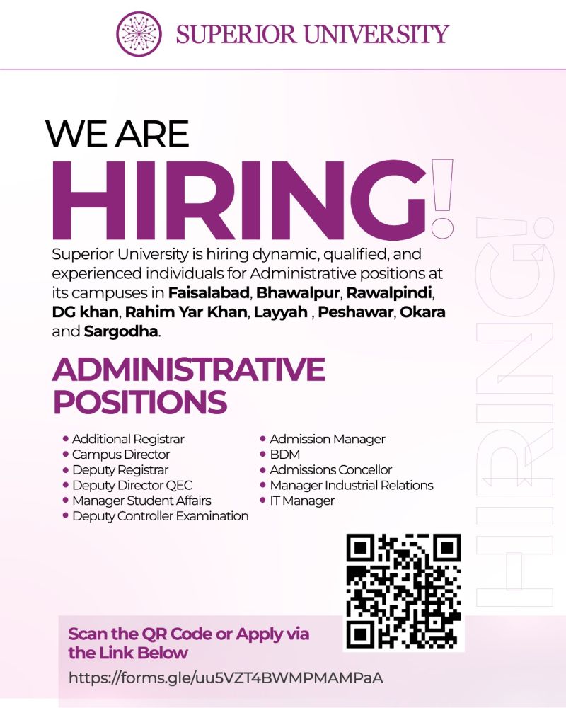 Superior University Official University is expanding across sub-campuses and we’re looking for dynamic, organized, and career-driven administrative talent ready to grow in a fast-paced academic environment.
