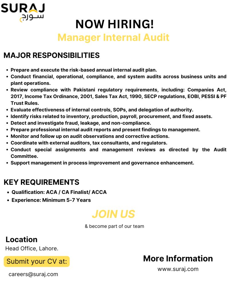 Suraj Cotton Mills Limited is looking for a talented and motivated MANAGER INTERNAL AUDIT to join our team at Head Office, Lahore.