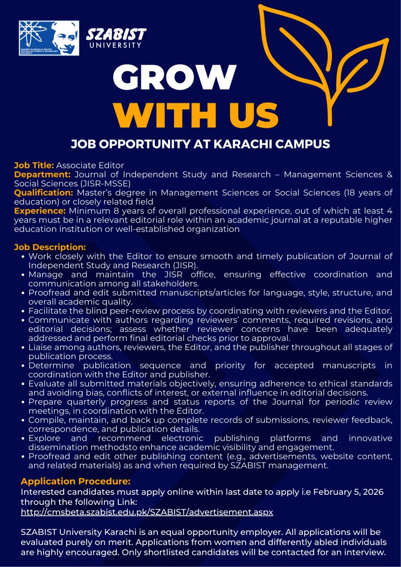 - Work closely with the Editor to ensure smooth and timely publication of Journal of Independent Study and Research (JISR).