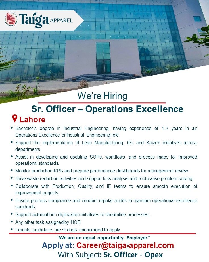 Taiga Apparel (Private) Ltd Jobs Senior Officer Operations Excellence