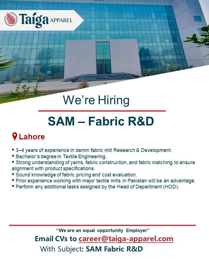 Taiga Apparel Pvt Ltd Jobs SAM Fabric R&D