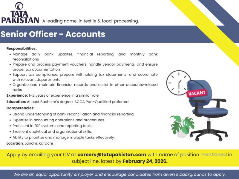 Tata Pakistan Jobs Senior Officer Accounts :