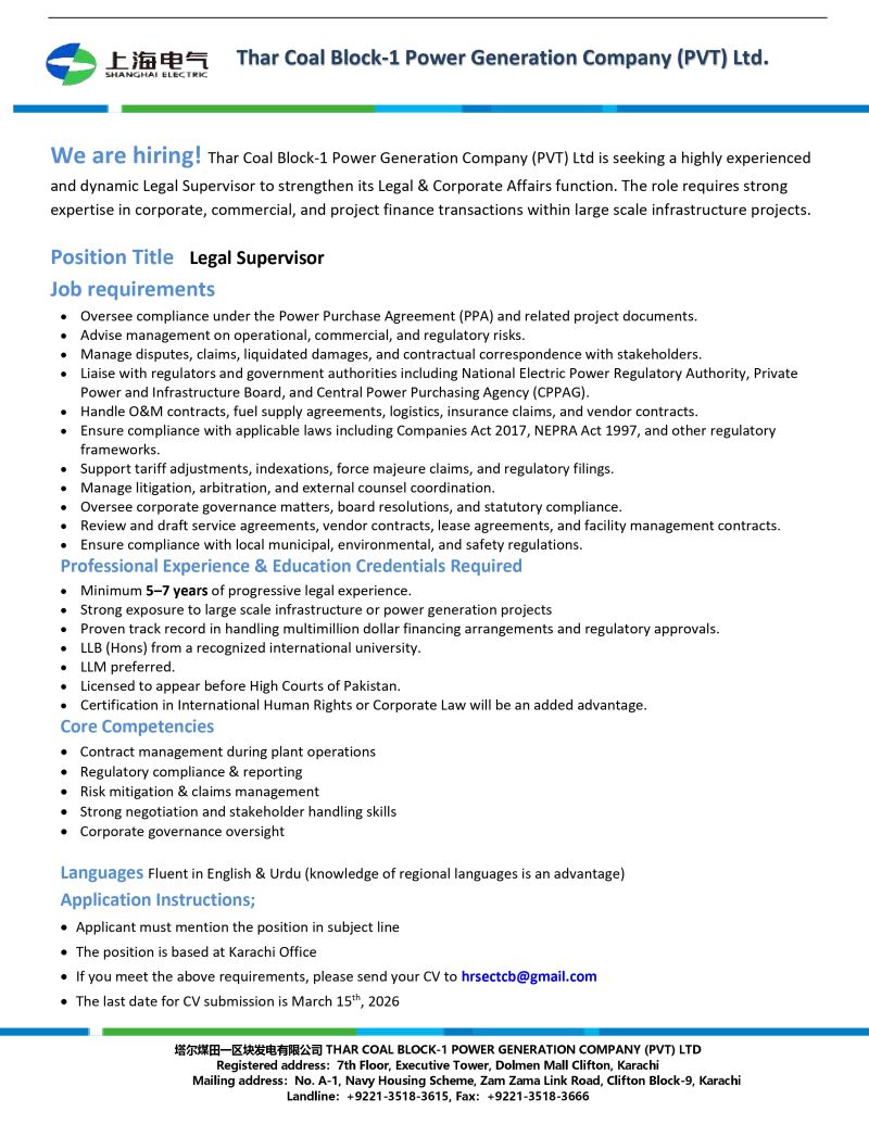 Thar Coal Block-1 Power Generation Company (Pvt) Ltd Jobs Legal Supervisor: