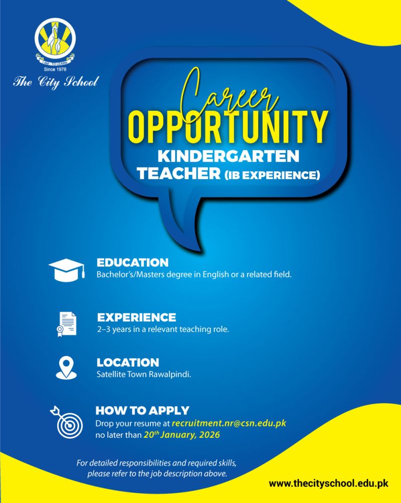 TheCitySchool is looking to fill the position of Kindergarten Teacher (IB Experience) at the Satellite Town Campus, Rawalpindi.