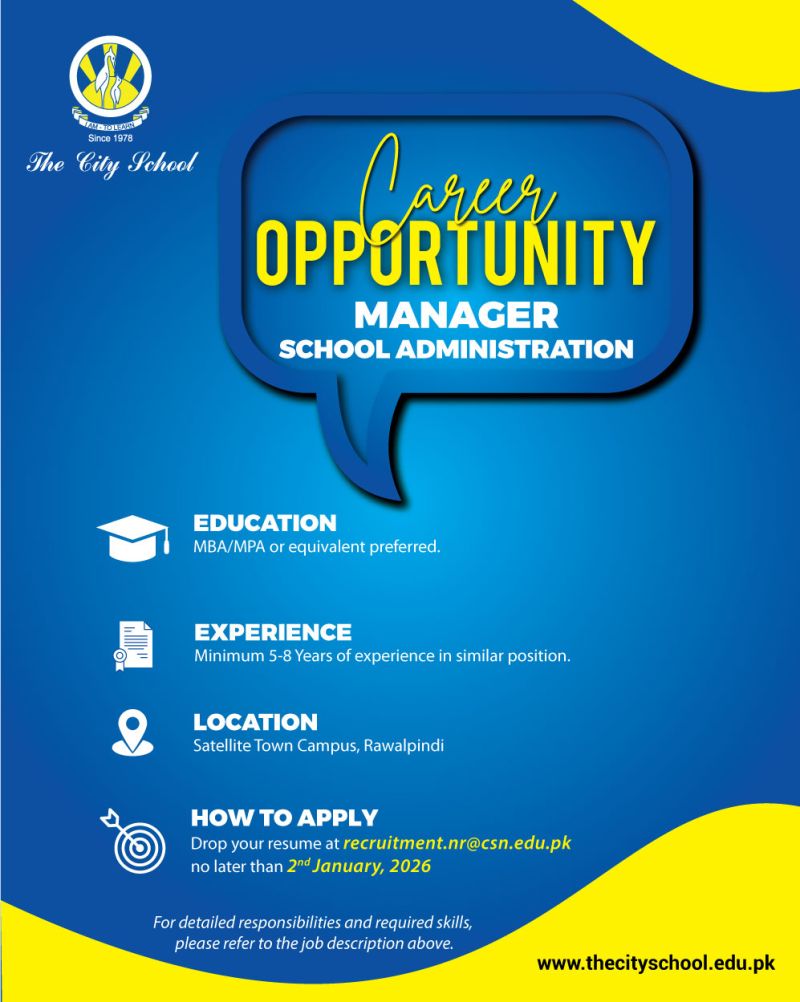 TheCitySchool is looking to fill the position of Manager School Administration at the Satellite Town Campus, Rawalpindi