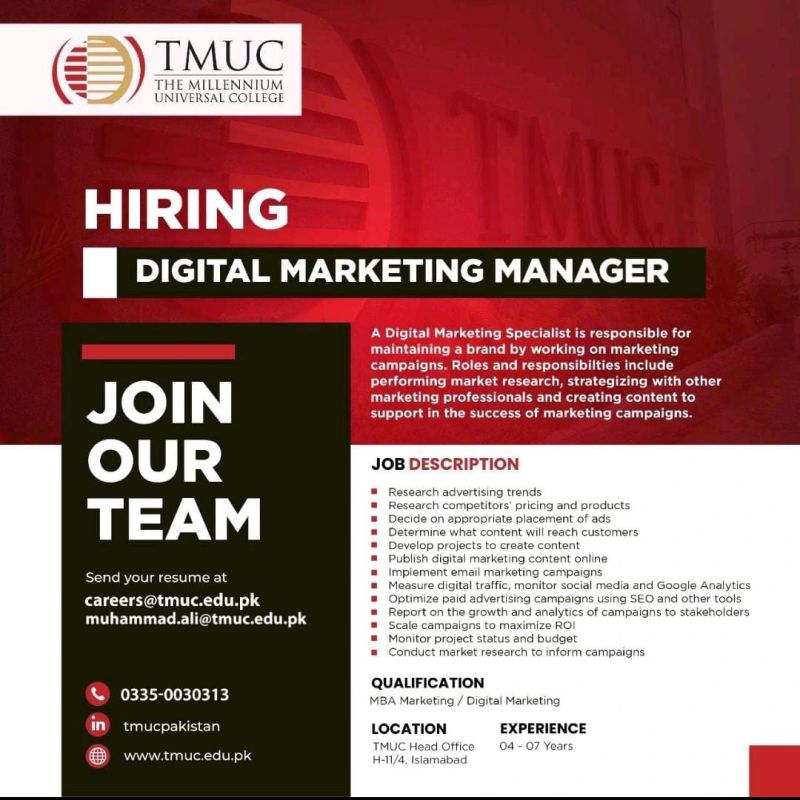 The Millennium Universal College TMUC Jobs Digital Marketing Manager: